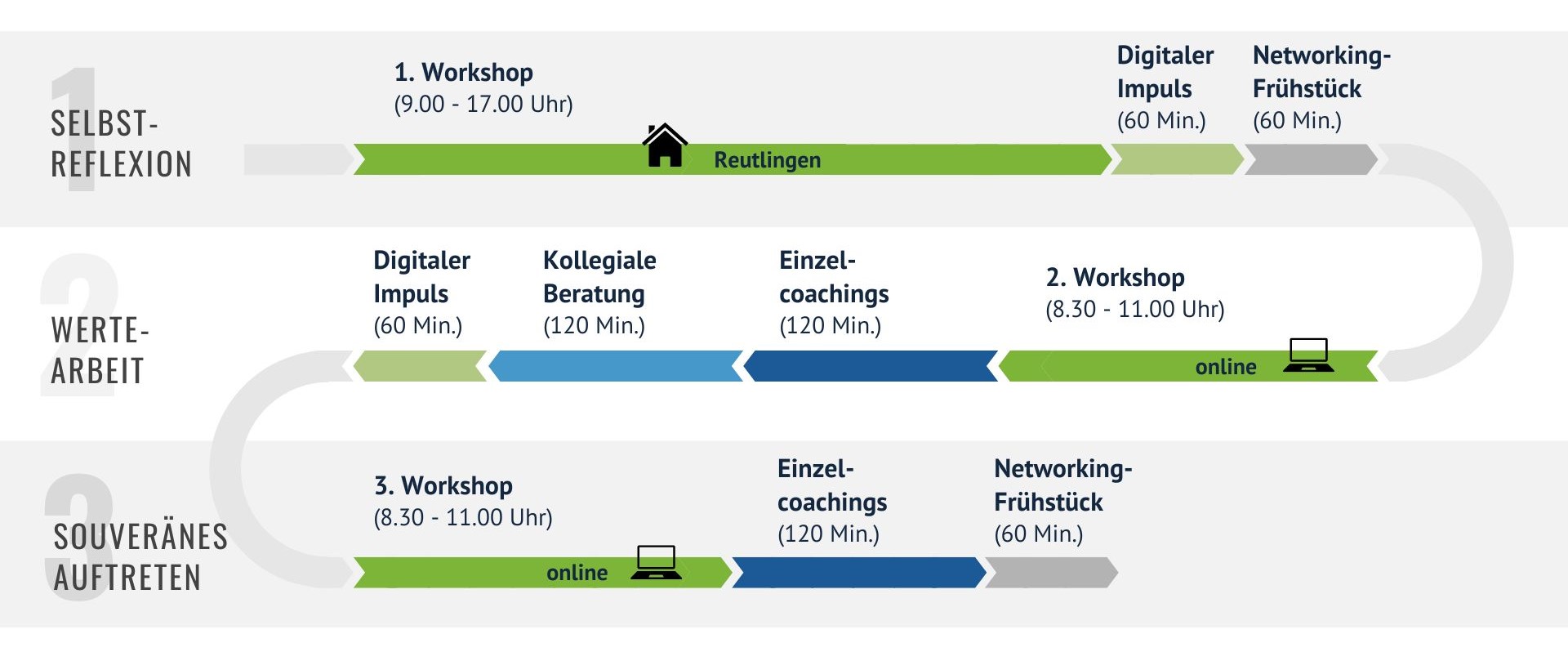 - Einzigartige Lernreise (optimaler Lernerfolg durch Blended-Learning-Forma; abgestimmter, verzahnter Wechsel aus praxisorientierten Workshops, Einzel- sowie Gruppencoachings, Selbstlernelementen und Reflexion in der Gruppe)